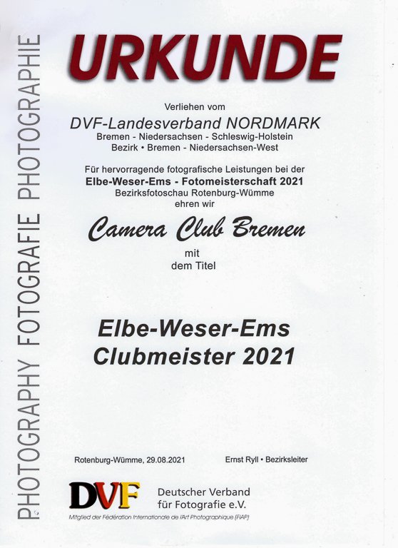 Der Camera-Club Bremen ist Fotoclubmeister 2021, Wolfgang Everding war mit 5 von 6 eingereichten Fotos erfolgreich und damit EWE Fotomeister 2021. Hier die Fotos unserer erfolgreichen Clubmitglieder mit den Urkunden (U) und den Annahmen (A).